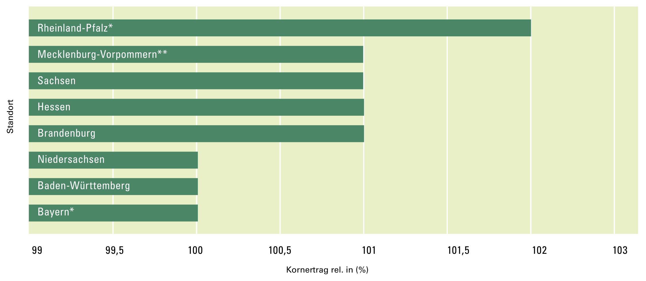 Quelle: Auszug Landessortenversuche Sommerhafer der Landesdienststellen 2025, Kornertrag rel. (%), behandelt, *Mittelwert der unbehandelten Stufe,