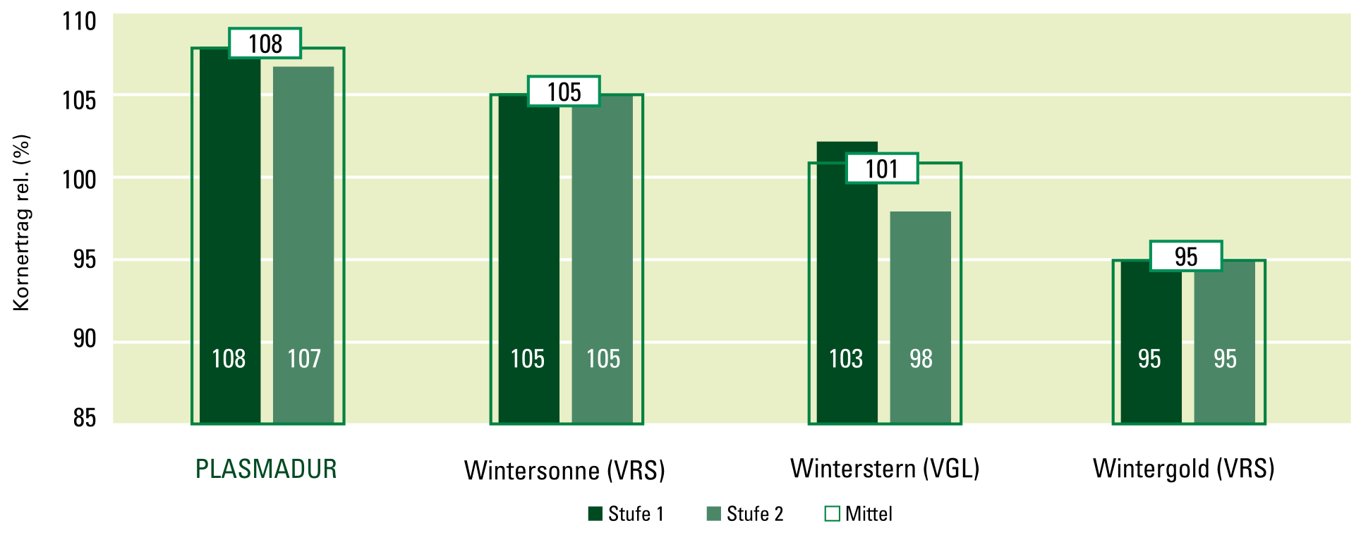 Quelle: Kombinierte LSV/ WP 2025 Winterhartweizen, Kornertrag rel. (%), behandelt und unbehandelt, PLASMADUR im Vergleich zu VRS und VGL, n=5