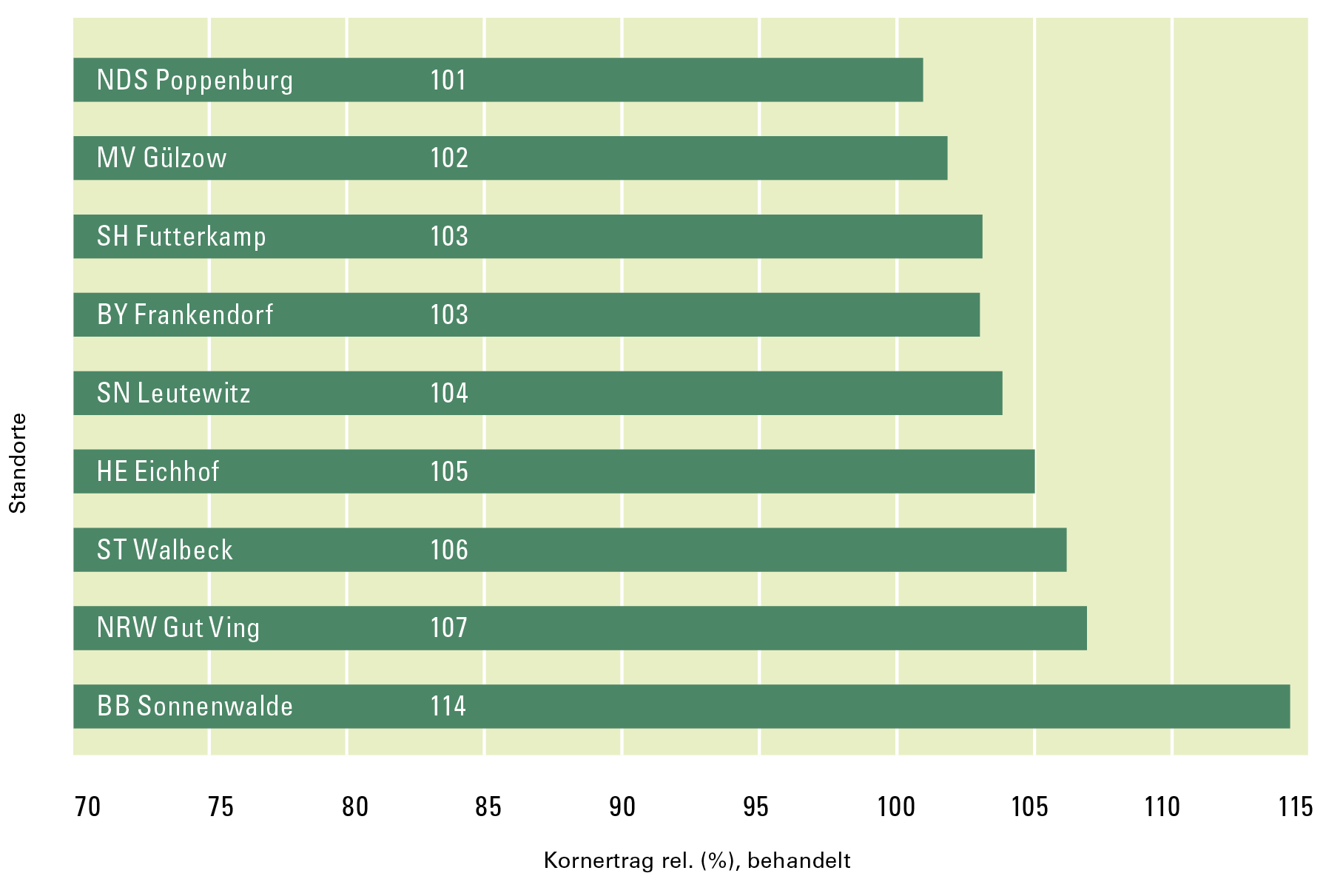Quelle: Auszug EU-Prüfung Winterweizen 2025, Kornertrag rel. (%), behandelt, n=9